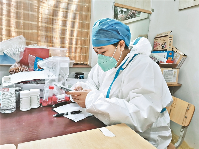 麻利地整理好當天核酸檢測的物資后,田麗娟便提前來到核酸采樣現場,確認“2米線”設置、物資擺放、核對數量……忙碌的一天開始了。“請大家有序下樓做核酸”“降溫了,記得多穿點”,田麗娟一遍遍在群里提示社區人員告知居民,從事社區工作近10年的她,不僅對轄區情況爛熟于心,更對居民多了親人般的關心和記掛。6時30分許,核酸采樣有序開始,偶爾碰到不太配合或有抱怨的居民,田麗娟總是第一時間上前耐心地解釋和勸導,保證現場秩序井然。