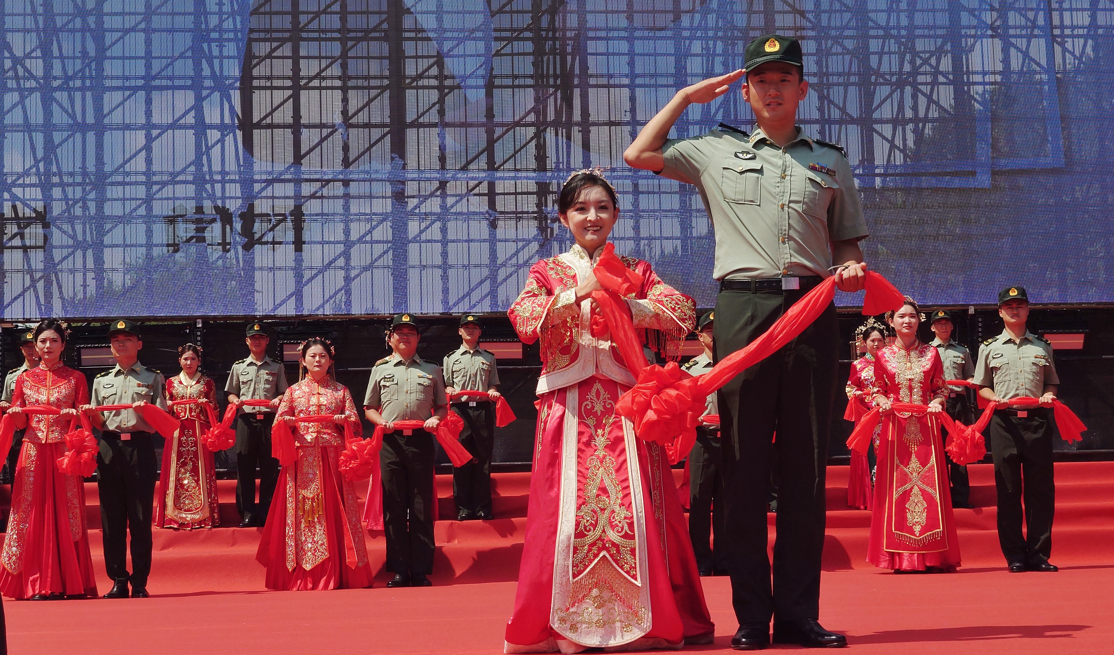 伴著悠揚的樂曲,身穿軍裝的新郎和穿著龍鳳袍的新娘,手牽紅色花球走上典禮臺,行結拜禮、結發禮等,并共同宣讀愛的誓言,許下相愛一生的承諾。