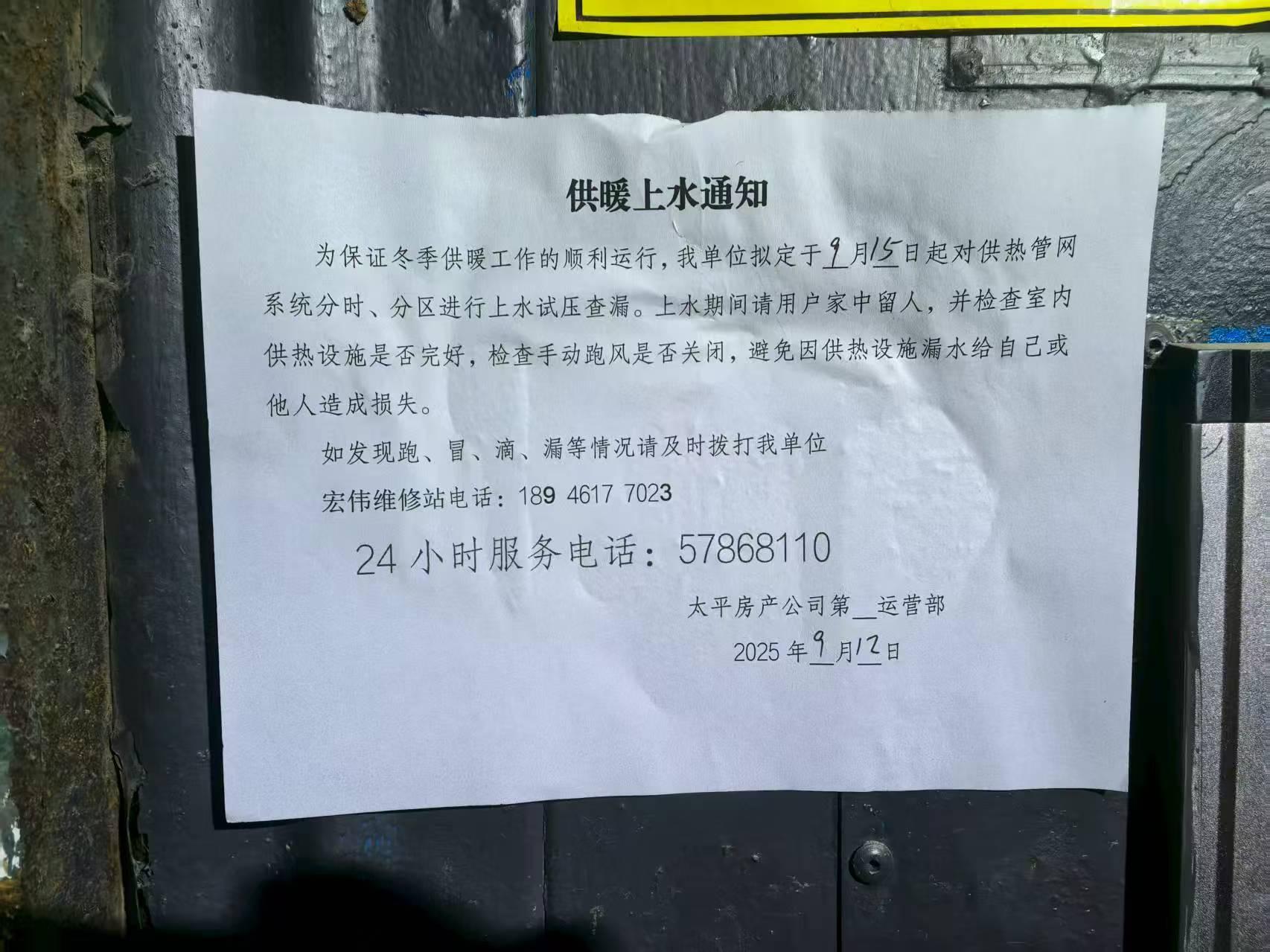 17日,道外區宇軒花園小區一期各單元門已張貼《供暖上水通知》。通知顯示,哈爾濱太平房產公司自9月15日起,對供熱管網分時分區上水試壓查漏,要求用戶家中留人,檢查室內供熱設施及手動跑風狀態,并公布了小區維修站和24小時報修熱線。據哈爾濱太平房產公司負責人介紹,其承擔道外區太平橋等區域616萬平方米供熱任務,服務7.6萬余戶,注水試壓工作預計9月30日左右結束。