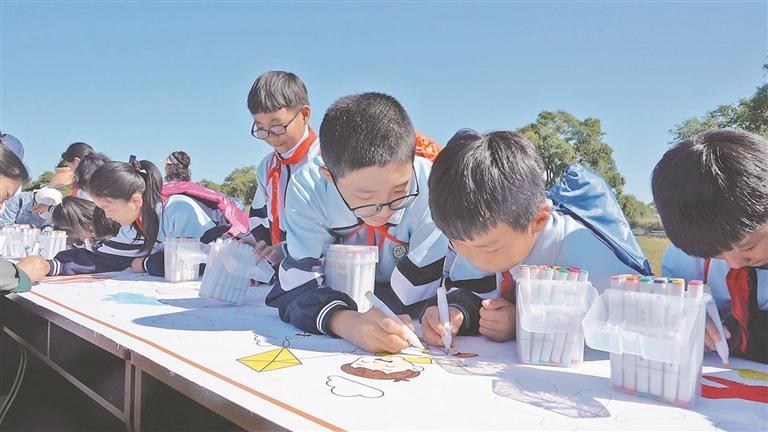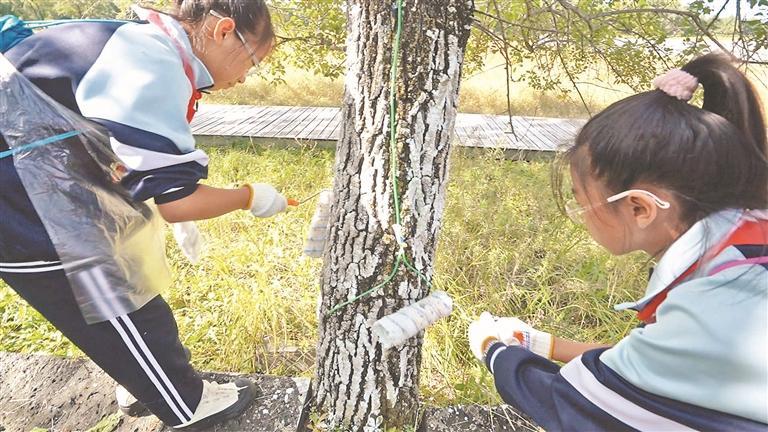 夕陽(yáng)西下,渤海國(guó)遺址的古樹(shù)群披上了金色的外衣。參與活動(dòng)的學(xué)生們也已經(jīng)完成了畫(huà)作和為樹(shù)干涂白的工作,臉上洋溢著勞動(dòng)后的喜悅與自豪。