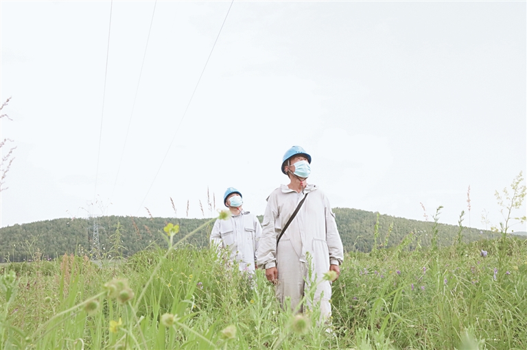 國網大興安嶺供電公司輸電運檢人員頂著烈日查看輸電線路。