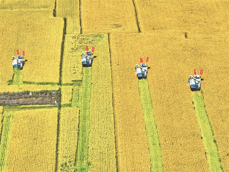 機械化收割水稻。
