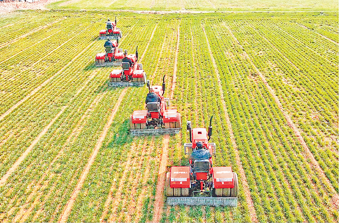 3月3日,濟寧市任城區長溝鎮振東家庭農場舉行春季農業生產暨旺長小麥機械鎮壓現場會,對旺長麥田開展機械鎮壓,控制小麥旺長,增強秸稈抗倒伏能力。圖片由大眾日報提供