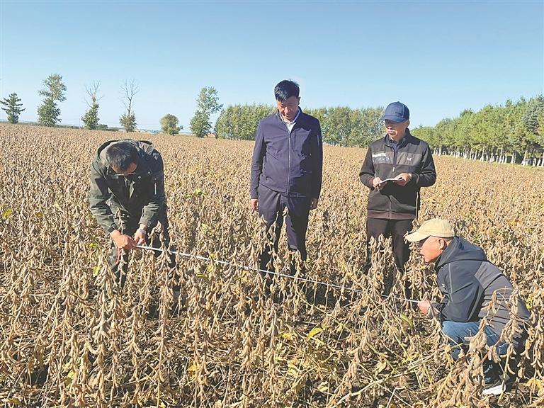 長水河農場農業科技服務中心與二井鎮農技推廣中心技術人員開展田間測產工作。劉曉巖攝