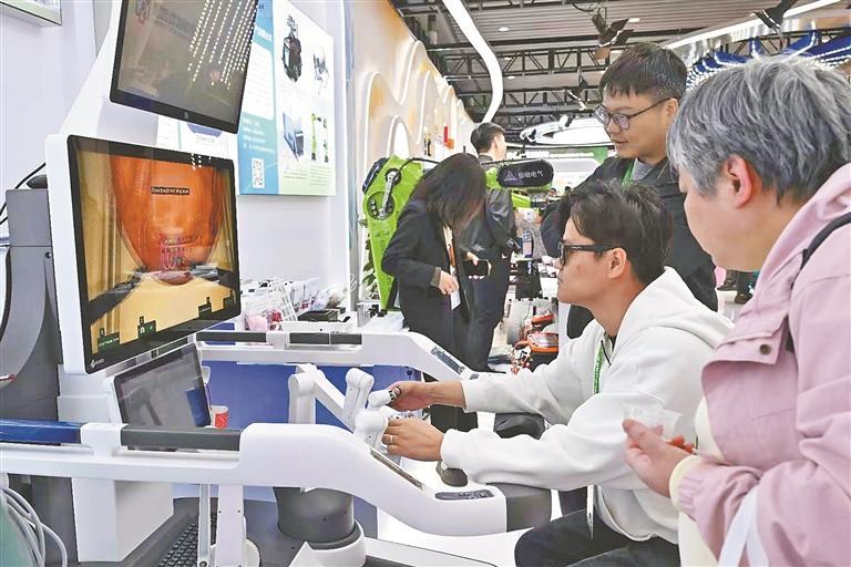 在思哲睿智能醫療設備股份有限公司展位前,一臺名為康多機器人^?的腔鏡手術機器人正流暢地進行著穿針引線演示。它是國內首個同時斬獲德國紅點、美國IDEA、德國iF三項國際設計大獎的手術機器人。公司副總經理楊文龍介紹,該產品突破了“卡脖子”技術,實現了國產替代,并已遠銷中亞、南美。