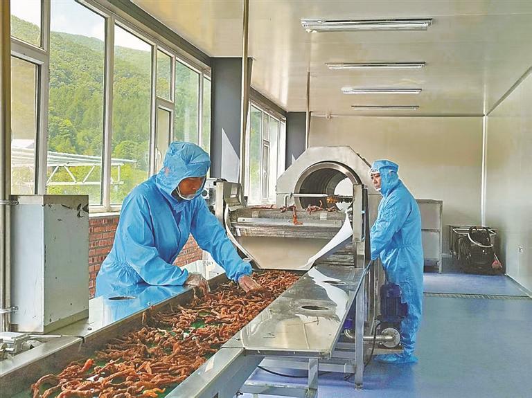 記者踩著晨露走進基地,幾臺根莖收割機沿著田壟緩緩前行,這些形似生姜的根莖,不久后經過清洗、蒸制、切片等傳統與現代工藝結合的加工流程,變身為黃精茶、黃精酒、黃精果脯等系列產品,通過線上線下渠道銷往全國各地。