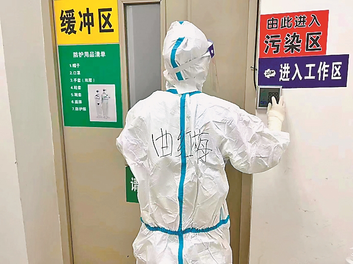 作為病區的護士長,曲紅梅不但參與護理,同時也是保潔員、心理治療師、康復師。“年紀最小的患者不足周歲,最大的患者94歲。面對病人的焦慮和恐慌,我們需要更悉心照顧,讓他們安心治療。”曲紅梅說,新冠病區的患者不能出入病區,醫護人員的工作量也更大,除靜點、發放口服藥等,護士還要承擔發飯、打水、發放生活物資等工作。
