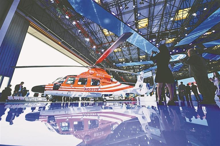 觀眾在天津直博會直升機館內參觀AC312E直升機。