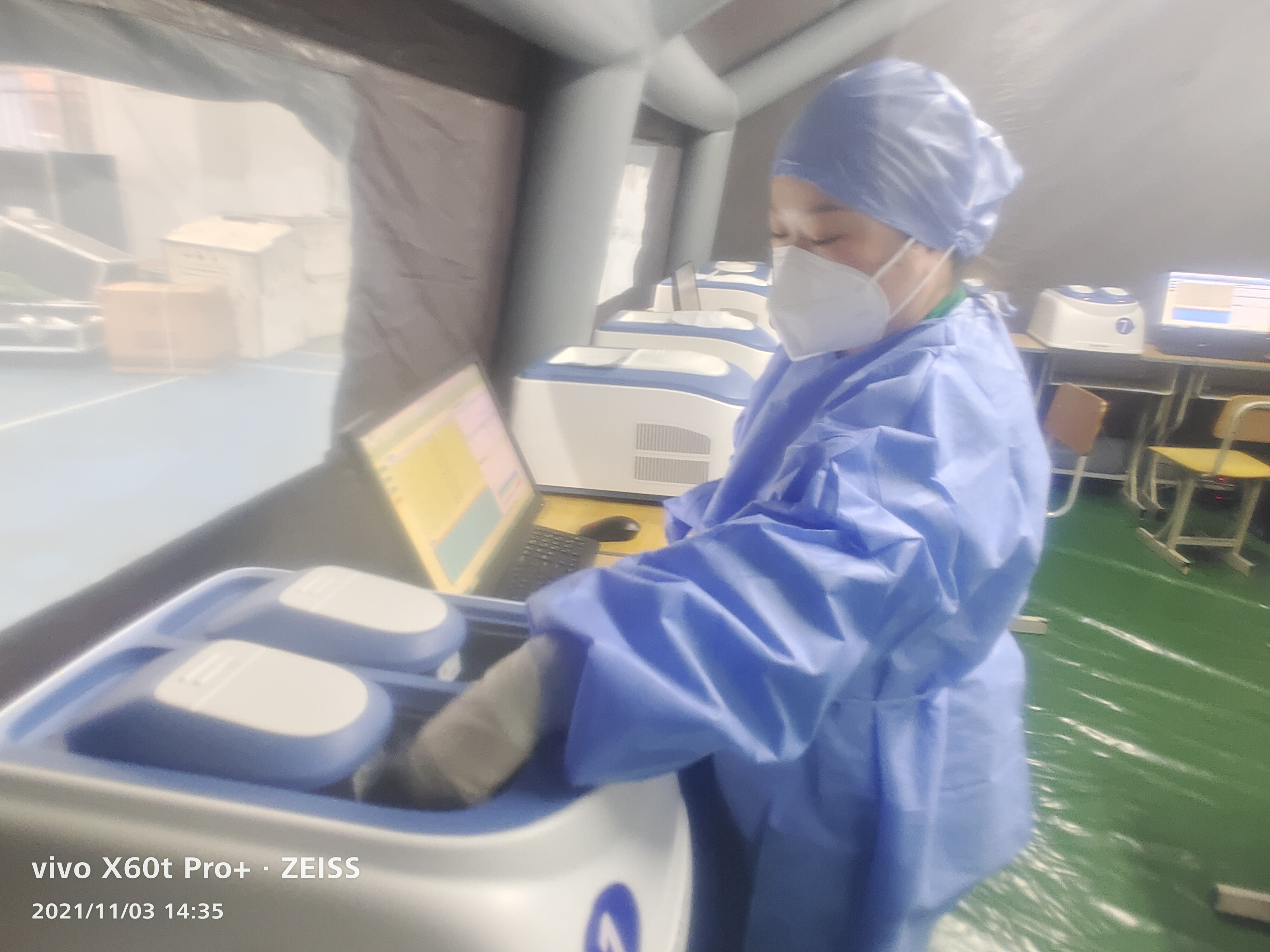 標本處理、提取、擴增……每一個環節有條不紊、緊密銜接,隊員們分工明確、各司其職,整個移動方艙實驗就像是一個現代化的“工廠”,運轉高效有序。從11月3日10時進艙,一直奮戰到當晚22時出艙。12個小時內,移動核酸檢測醫療隊高效率且保質保量地完成11310管,共計11.3萬人次的核酸檢測,在黑河戰“疫”前線再次實現日核酸檢測量過萬的驕人戰績。