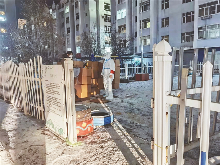 11月7日,在安發(fā)家園小區(qū),熱電廠值守卡口的黨員在雪夜中為居民發(fā)放物資。“要將這些關(guān)愛第一時間發(fā)到居民手中。”黨員姜行行表示。