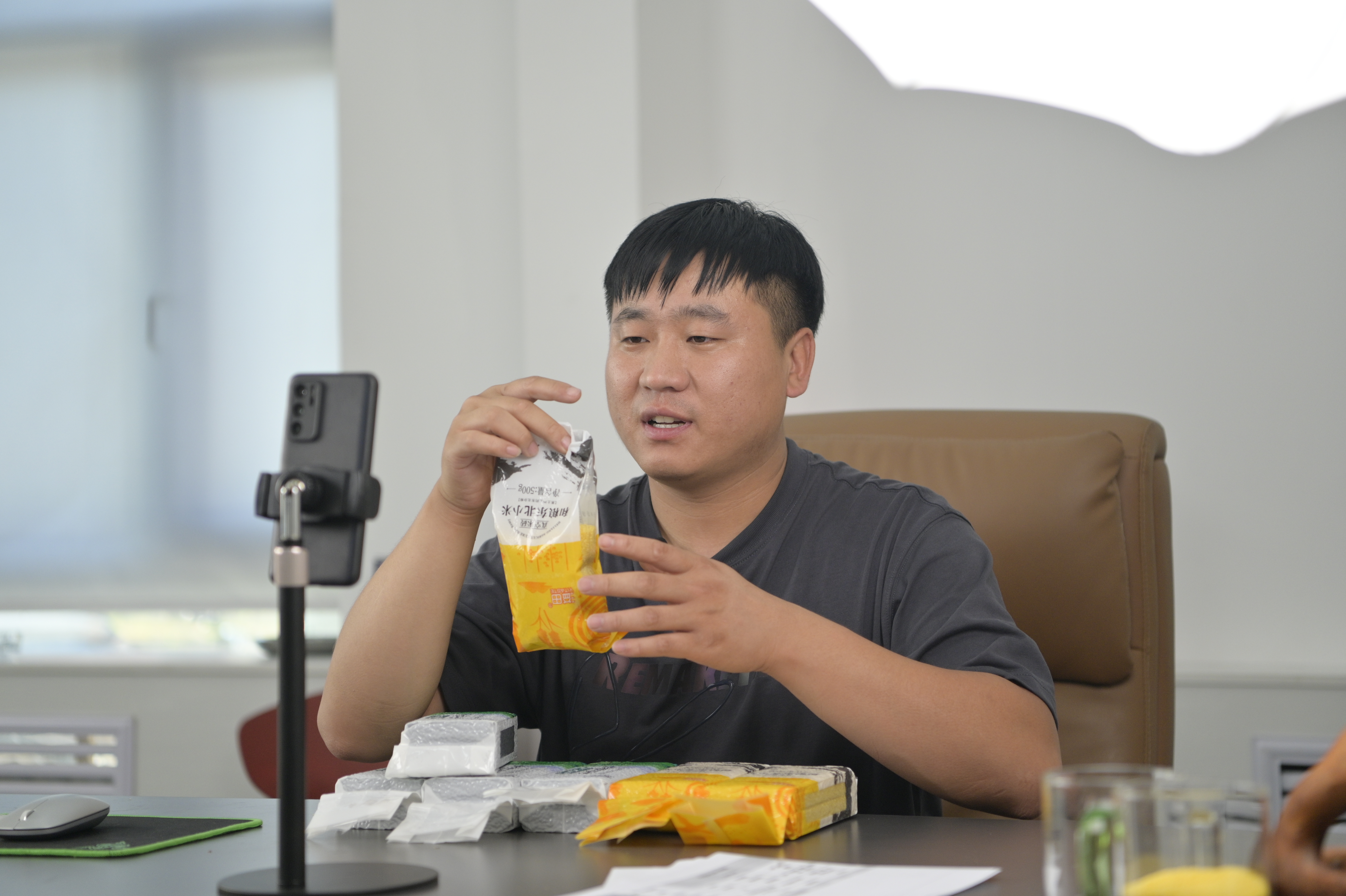 在饒河縣直播電商孵化基地,盧戰開忙著在流水線上幫忙打包蜂蜜,為直播帶貨選擇產品。在政府部門支持下,盧戰開將工作室從村里搬到了縣里,入駐了電商基地。