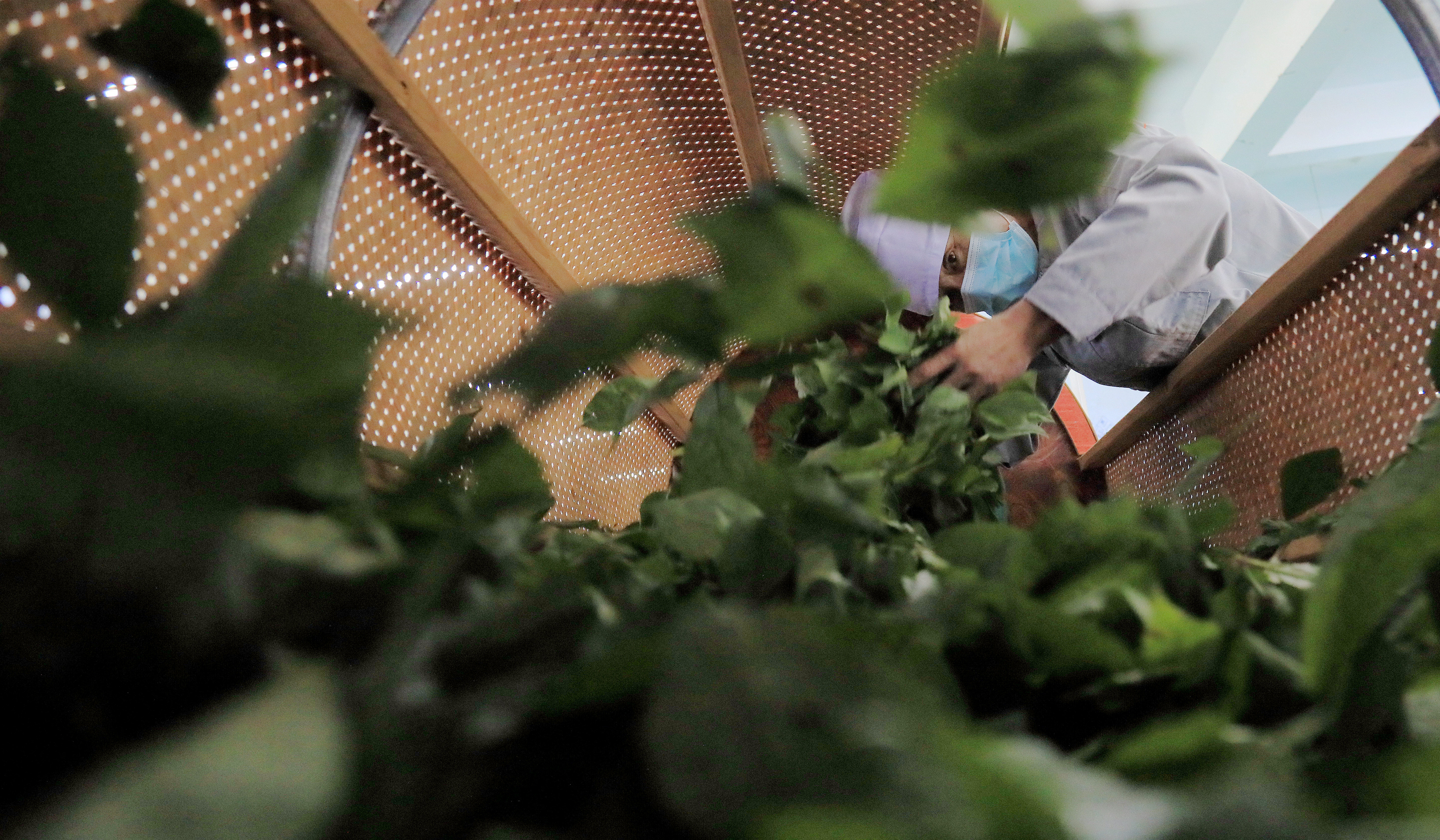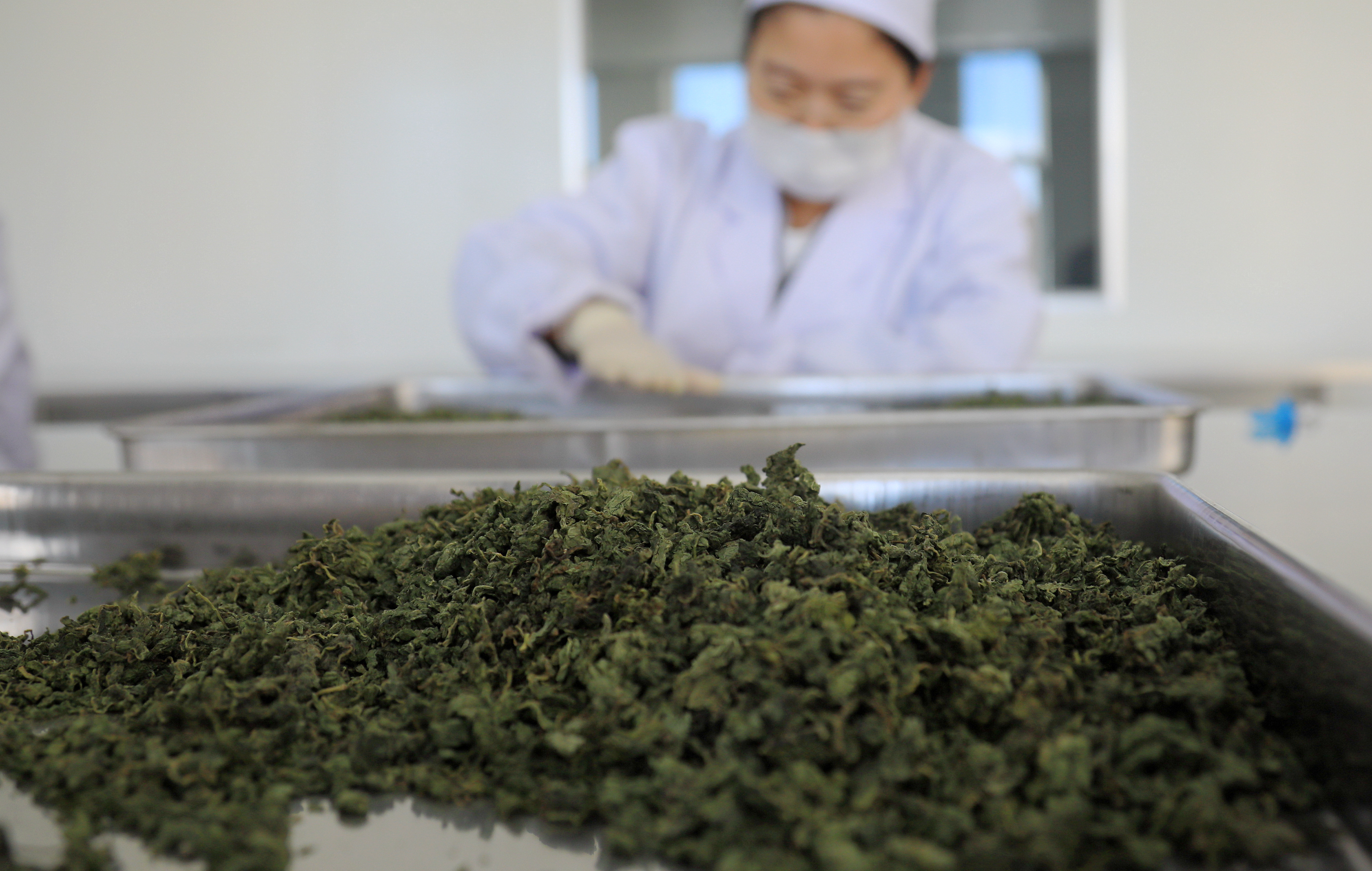 工人將刺五加嫩葉放入搖青機(jī)中處理