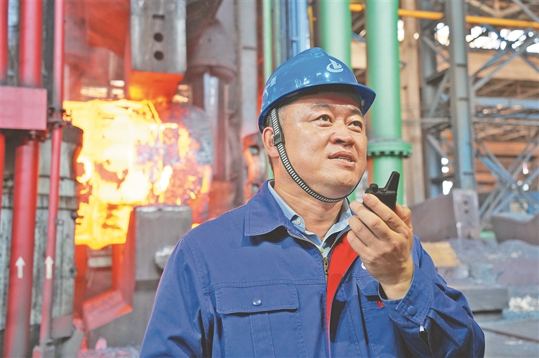在中國一重水壓機鍛造廠生產車間內,劉伯鳴穿著整潔的工服,眼睛緊盯著水壓機下正在不斷鍛打的國內最大的5.5米支承輥,并時刻用手中的對講機與工友們溝通下一步的具體操作。