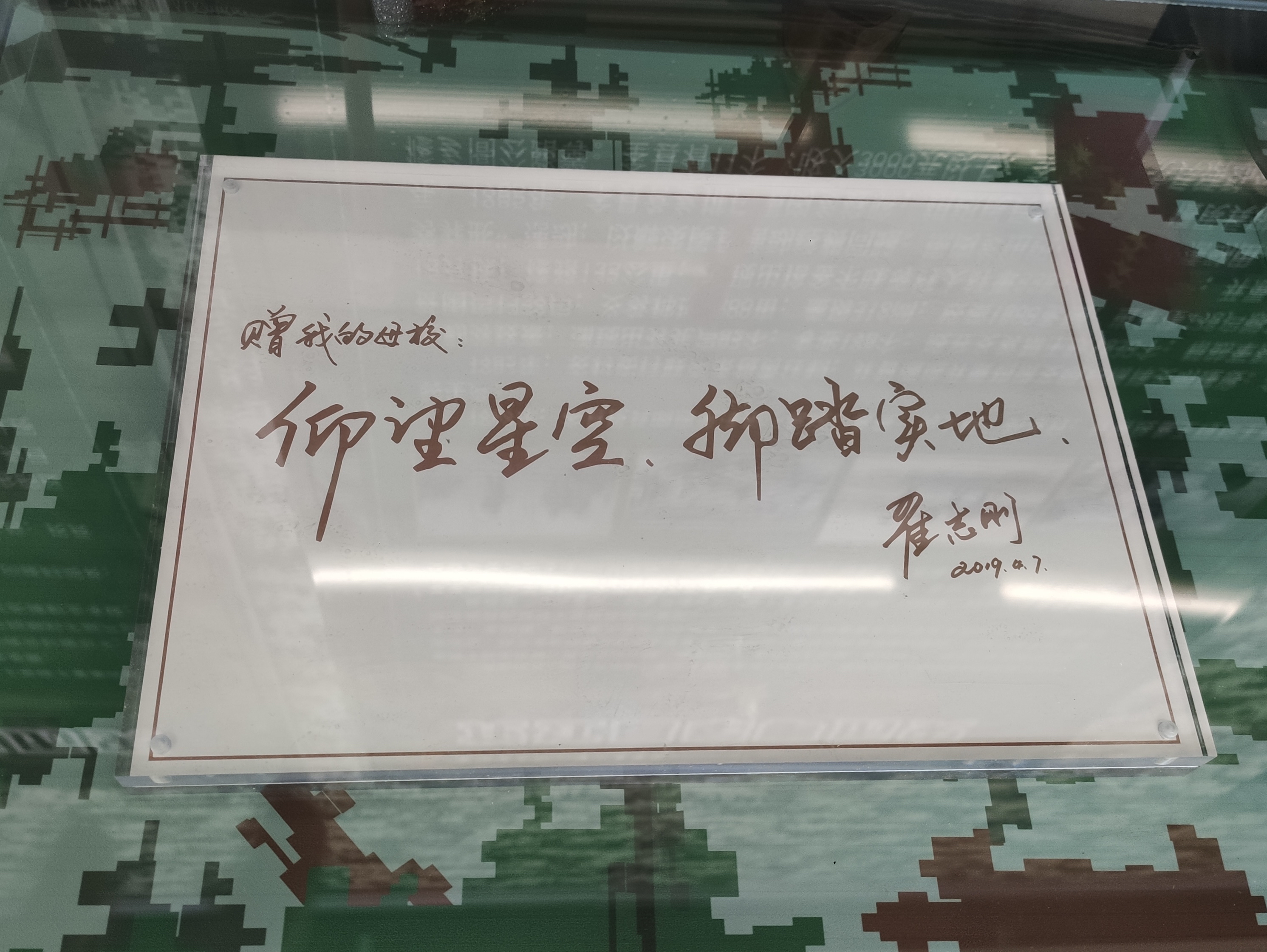 走進志剛小學教學樓,墻壁“星辰藍”的顏色呈現在眼前。在墻的下面擺放著孩子們做的模型:航天發射器、飛機、坦克等,逼真的模型,讓記者不禁為孩子們的想象力和動手能力點贊。在大廳的中間擺放著翟志剛回母校時與孩子的合照,抬起頭能看到一片藍色的星空,旁邊寫著四個大字——仰望星空。2019年翟志剛回學校時曾為母校題字“仰望星空 腳踏實地”,這是他對孩子們的期許,也是對未來棟梁的殷切盼望。