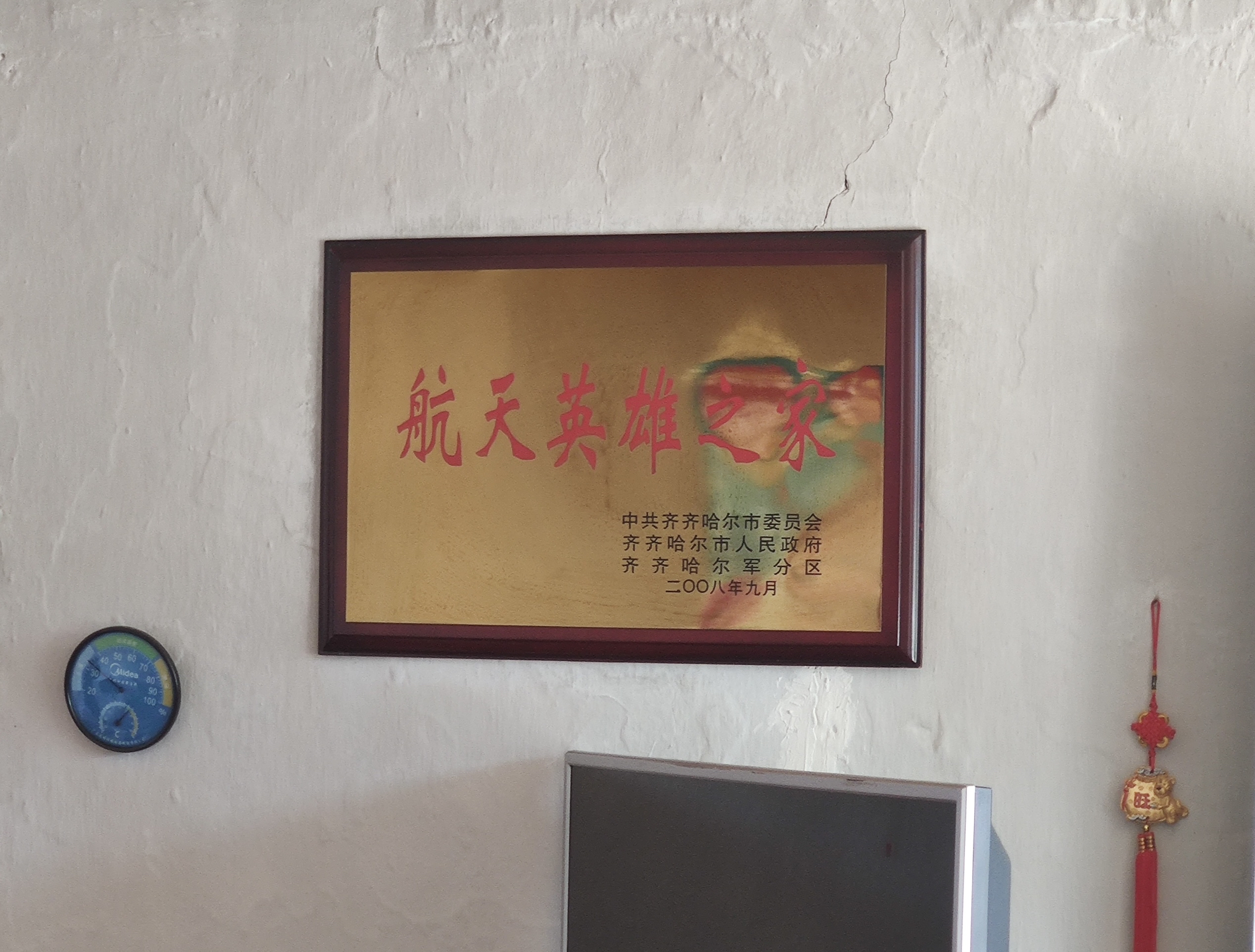 龍江縣之旅結束前,記者一行來到翟志剛家的老房子拜訪了翟志剛的哥哥翟志強,金色的“航天英雄之家”的牌匾懸掛在翟志強家中的電視上方,一塵不染閃爍著光芒。他從一個陳舊的紅色木頭箱子中拿出一個嶄新的航天模型給記者看:“這是志剛送我的……”臉上滿是自豪。