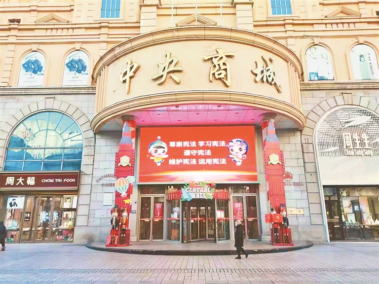 在哈爾濱中東鐵路橋上,數十塊宣傳展板“煥然一新”,集中展示“八五”普法規劃的主要目標、吸引市民拍照打卡留念。此外,哈爾濱市主要道路和顯著位置大型戶外電子屏播放著哈爾濱市原創“冰冰夏夏帶你學憲法”普法動漫和宣傳海報,利用市政府廣場、群力音樂公園、防洪紀念塔周邊等公園綠地、城市綠化帶開展的憲法普法宣傳與廣大市民“天天見”。