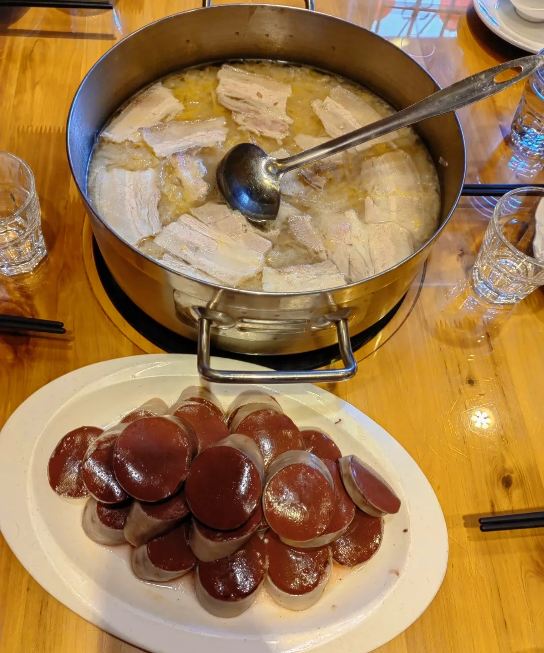 在肉類攤區,攤主將一口大鍋架到門口,鍋里煮著大腸和豬蹄,旁邊的大盆里還裝著不少提前加工好的血腸,熱氣騰騰、香味四溢。肉攤旁邊的凍貨區也是熱鬧非凡,整齊排列的各種凍魚、黃澄澄的凍柿子、帶著冰碴的凍梨都成了早市上的“香餑餑”。