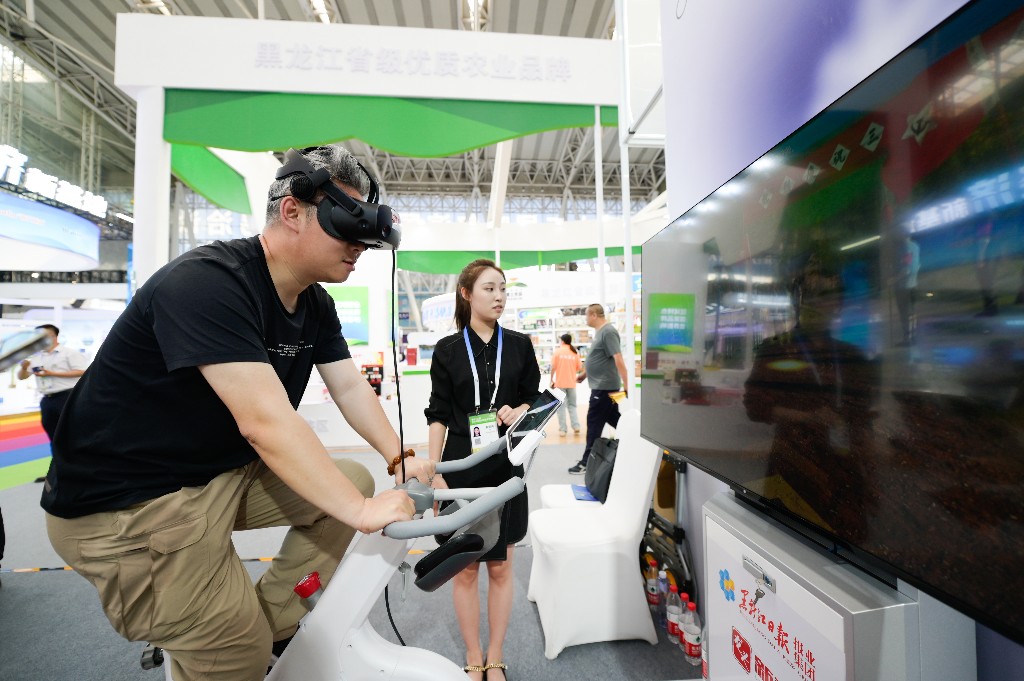 參觀者在黑龍江日報報業(yè)集團展區(qū)體驗VR紅色騎行