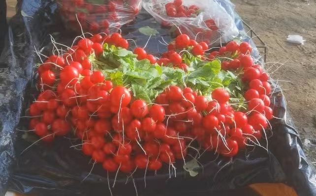 50歲的男主人時圣君推著一小車“紅丁”向記者走來,陽光灑滿了他微笑的臉龐。他是土生土長的曙光村農民,有著30多年的種菜經驗。時圣君告訴記者,去年11月末開始,他家的3棟溫室大棚先后種下紅丁蘿卜,如今訂單很多,批發每斤5.5元,這棟棚不到3天就采摘完了,收獲3000多斤,旁邊還有兩棟打算除夕和大年初一再上市,一定能賣上更好的價錢。