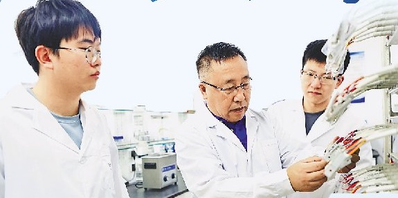 哈工大教授袁國輝(中)指導博士生研究采用石墨負極材料的鋰離子電池。 本報記者 韓東賢攝