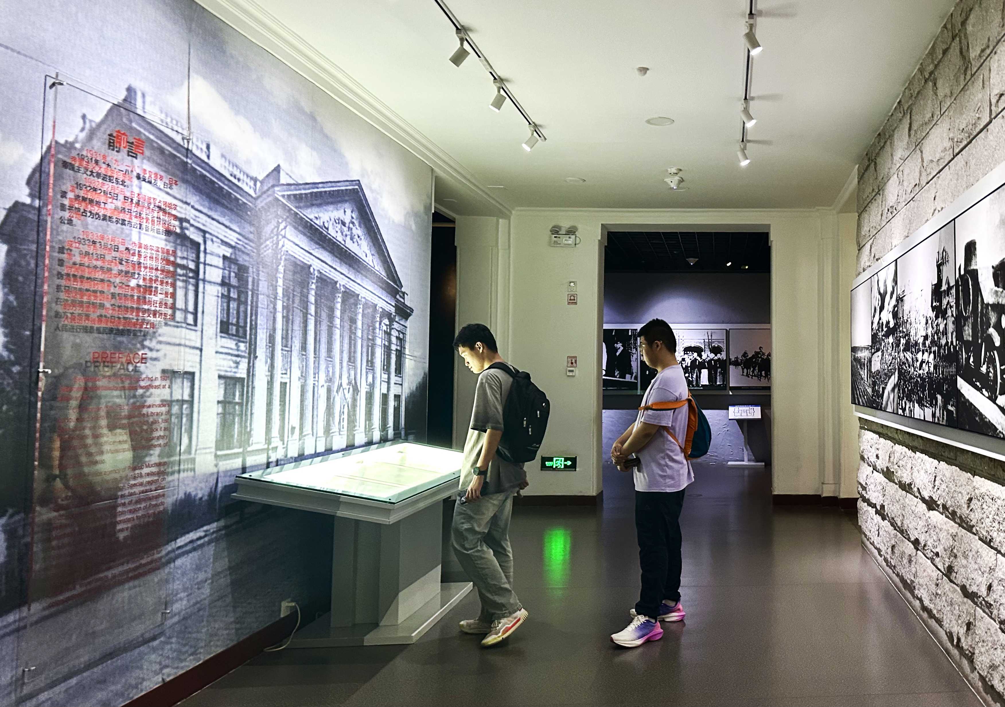 一對母子在《偽滿洲國哈爾濱警察廳遺址及罪惡展》展示墻前,認真閱讀抗日英烈們可歌可泣的事跡介紹
