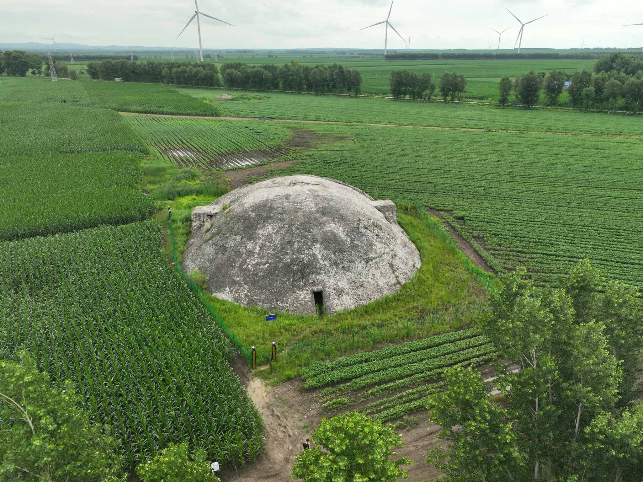 向土龍山鎮東行約1.5公里,一座形似巨大頭盔的混凝土建筑突兀地蟄伏于曠野——這便是“土龍東門外飛機堡”遺址。它是當年日本為侵略擴張所建龐大機場網絡中僅存完整的飛機庫,直徑逾10米,墻體厚達60厘米,冷硬地矗立了八十余載。