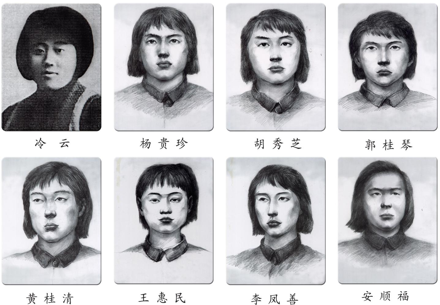 請記住:她們是共產黨員、抗聯二路軍五軍婦女團指導員冷云,共產黨員、五軍婦女團班長楊貴珍、胡秀芝,五軍婦女團戰士郭桂琴、黃桂清、王惠民、李鳳善(朝鮮族)和二路軍第四軍共產黨員、被服廠廠長安順福(朝鮮族)。