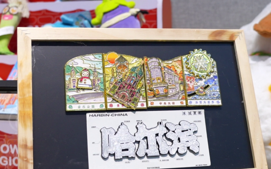 學生代表萬明宇設計的“哈爾濱四季冰箱貼”成為了展區的一個亮點。作品選取春季音樂公園、夏季索菲亞教堂、秋季中央大街、冬季冰雪大世界四大地標,不僅以細膩插畫還原地域風貌,更巧妙加入互動組件,讓靜態景觀可觸可玩;另一款融合哈爾濱地標建筑、特色美食與人文風情的文字冰箱貼,則滿足購買者收藏需求,成為傳遞城市魅力的便攜載體。