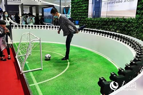 市民在足球互動展區感受“超高清+自由視角”的精彩瞬間。人民網 劉卿攝