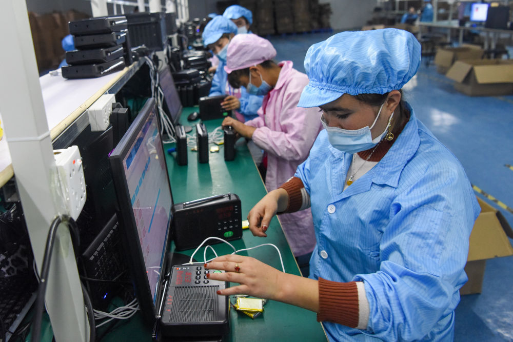 在位于新疆策勒縣天津工業(yè)園區(qū)內(nèi)的智能制造產(chǎn)業(yè)園,工人在流水線上忙碌(2020年11月4日攝)。新華社記者 丁磊 攝