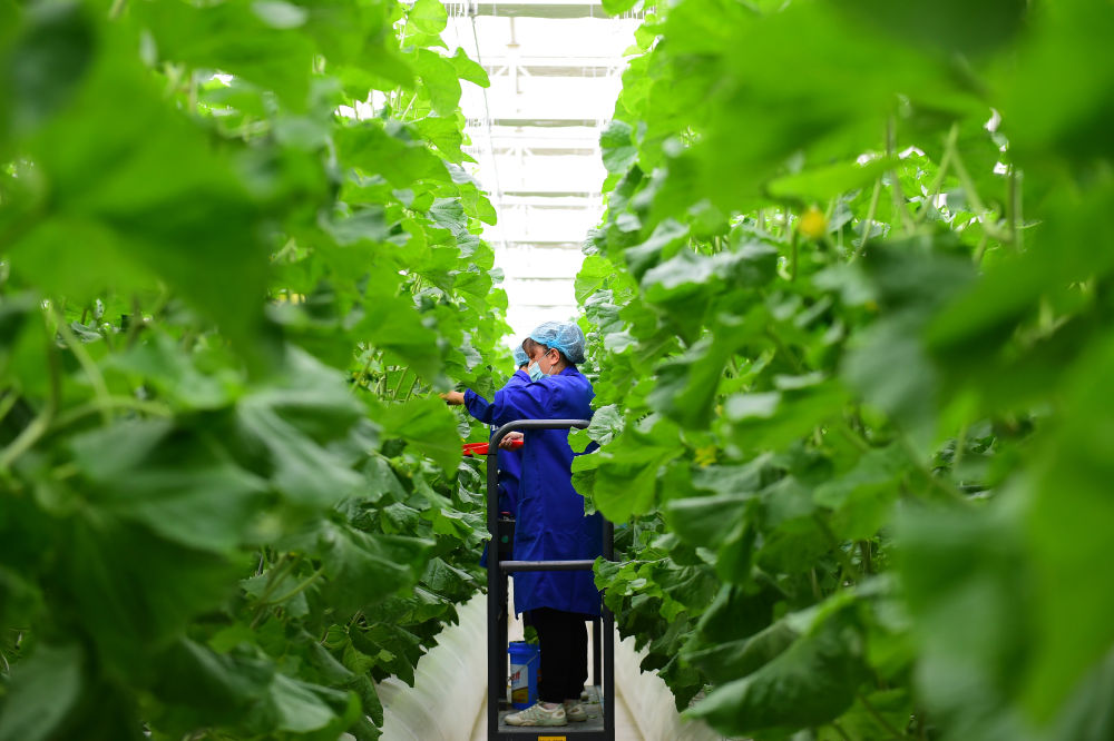 在位于新疆疏勒縣的新疆喀什現(xiàn)代蔬菜產(chǎn)業(yè)園,工作人員在智能玻璃溫室內(nèi)為甜瓜苗授粉(4月17日攝)。該蔬菜產(chǎn)業(yè)園由山東省援建,預(yù)計(jì)年產(chǎn)新鮮蔬菜150萬噸,穩(wěn)定提供3000個(gè)就業(yè)崗位,帶動(dòng)南疆地區(qū)蔬菜產(chǎn)業(yè)發(fā)展。新華社記者 侯昭康 攝