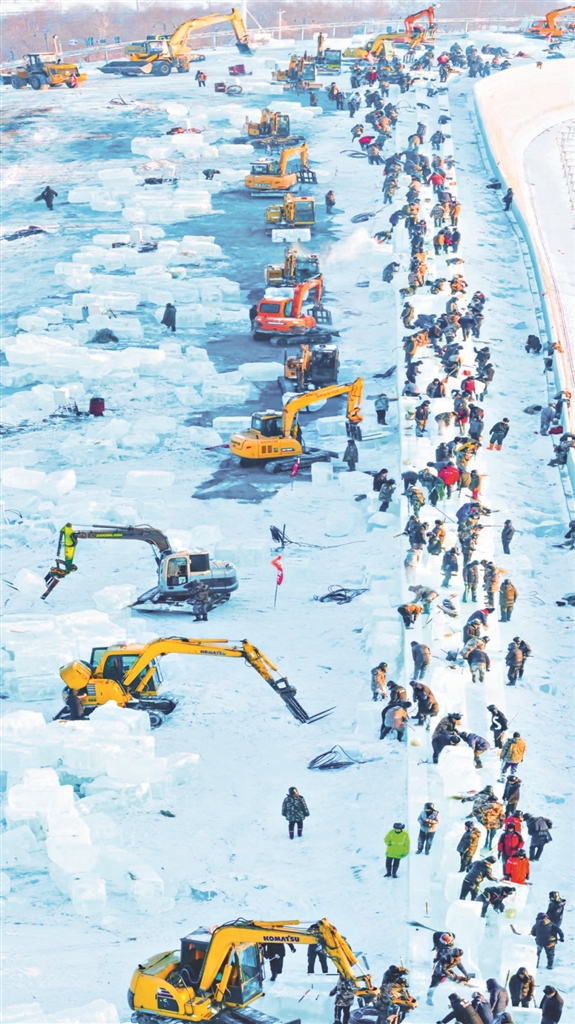 近日,哈爾濱市室外最低溫度在-20℃左右,寒氣逼人。在哈爾濱冰雪大世界園區,近萬名工人、近千輛機械緊張忙碌著。截至目前,園區主塔、超級冰滑梯、冰心筑夢、冰河萬象、冰雪歷程等大小景觀均在有序建設中。其中,園區主塔鋼結構搭建已完成,進入底部造型冰體砌筑階段,整體施工進度完成30%。據悉,哈爾濱冰雪大世界的冰建施工期僅有半個月左右,為了搶進度,冰建施工晝夜不停。