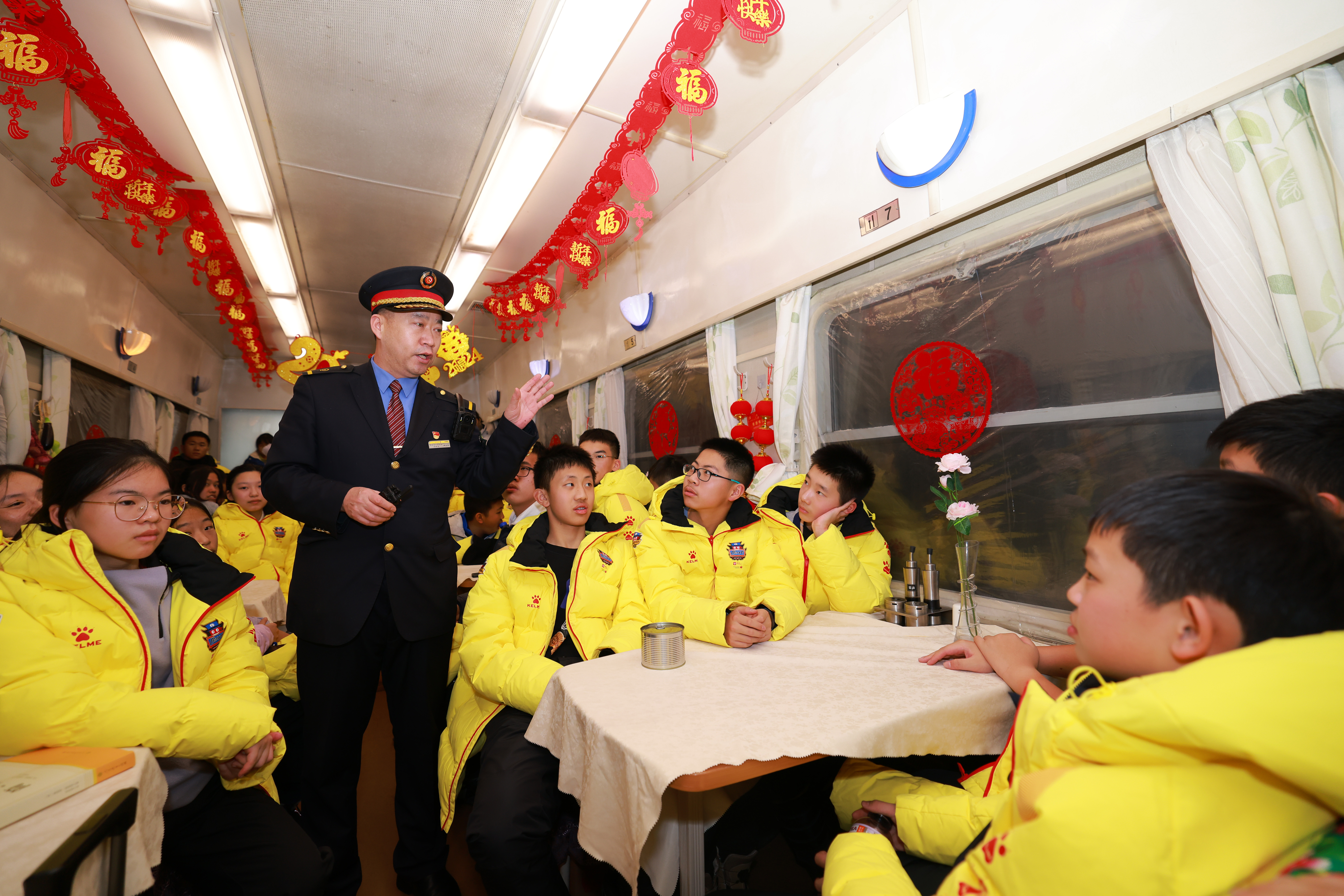 隨后,中國鐵路哈爾濱局集團公司齊齊哈爾客運段k7041次列車長周立華為學生們介紹了鐵路乘車安全須知,重點講解哪些設備不能碰、哪些行為不能做,在互動問答中提升了學生們的安全意識。考慮到游學團隊內還有小學生,周立華又現場組織11號車廂乘務人員主動對接老師,重點幫扶照顧學生們,密切觀察小旅客狀態,全力保障乘車安全。