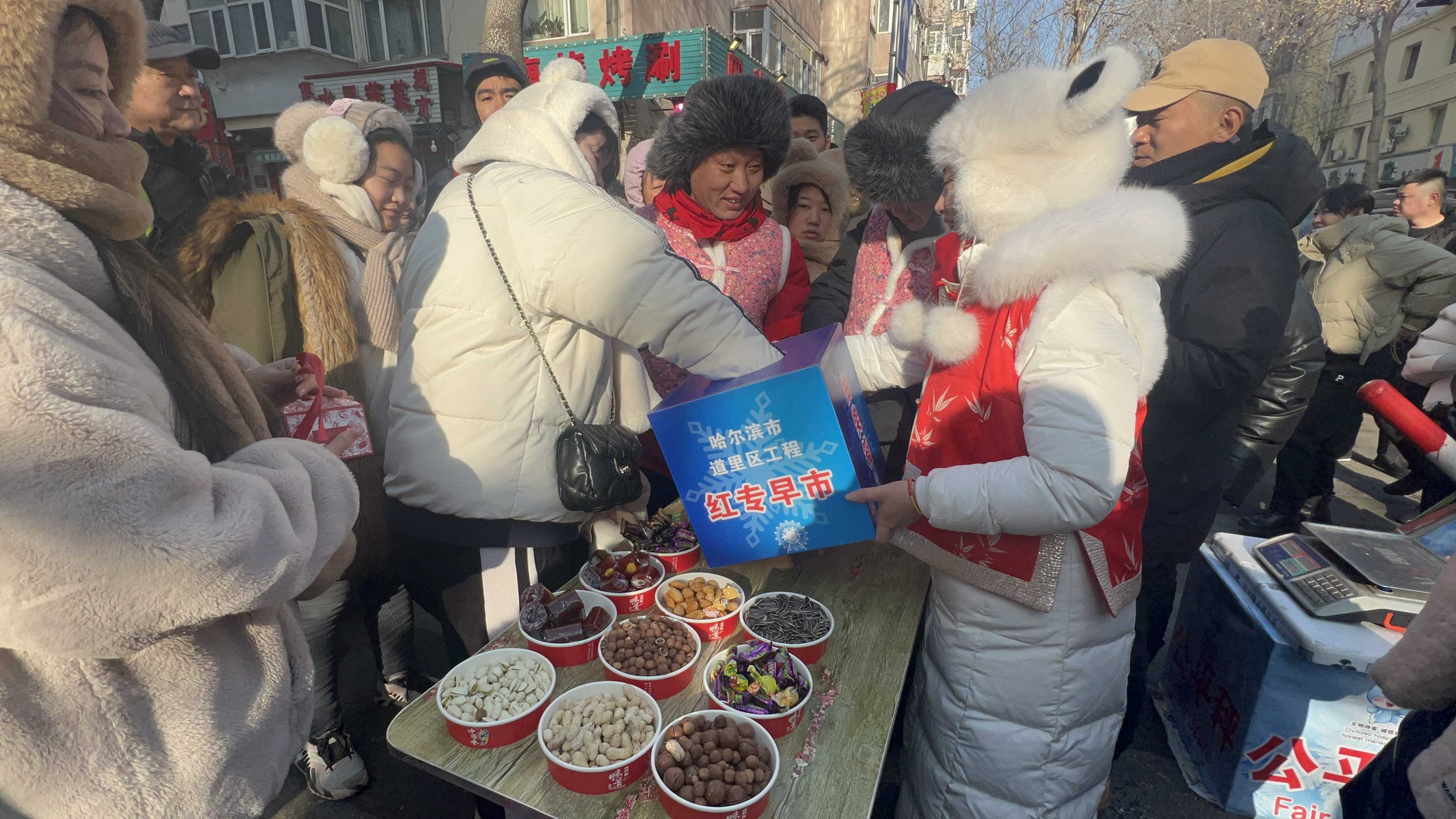 早市街頭懸掛“歡迎全國各地小金豆來‘爾濱’過大年!紅專早市等你!”的暖心條幅,精心策劃推出免費抽獎活動。或許是幾塊錢的現金紅包,也許是免費購物券,亦或是一碗羊湯、一副鞋墊,意外之喜讓游客牽到了“哈爾濱大哥”的手。