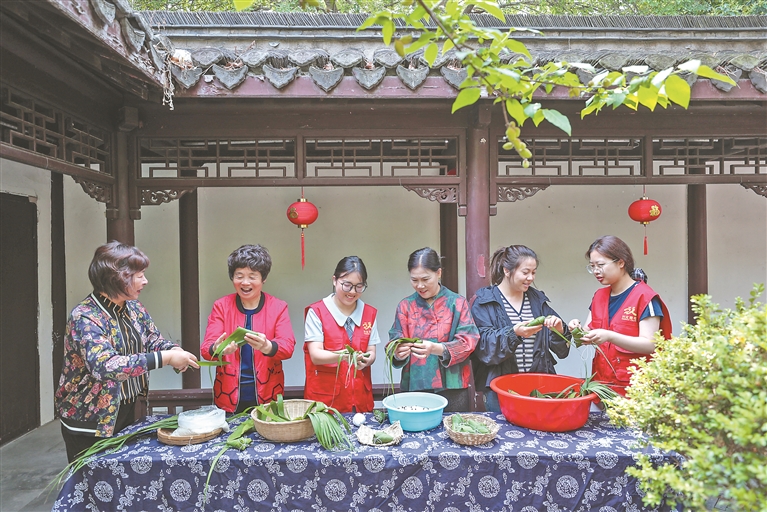 在位于江蘇省興化市昭陽街道的興化書院,青年志愿者和社區居民一起包粽子。
