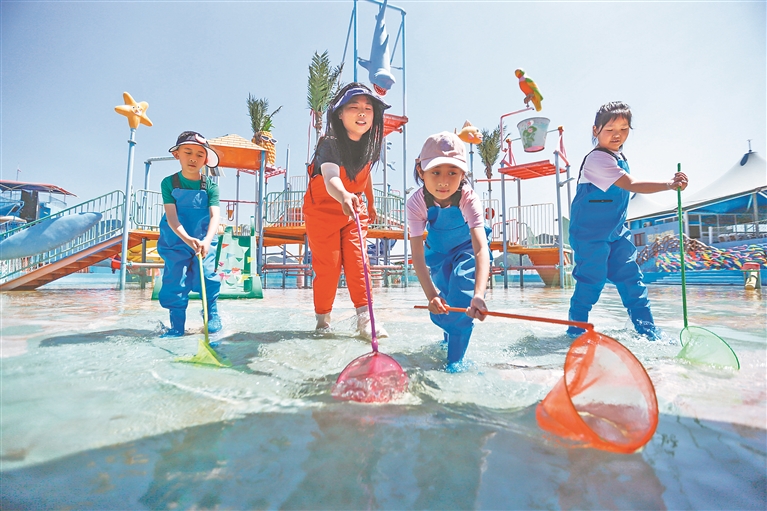 游客在河北省遵化市南山常樂谷景區水世界參加親子撈魚活動。