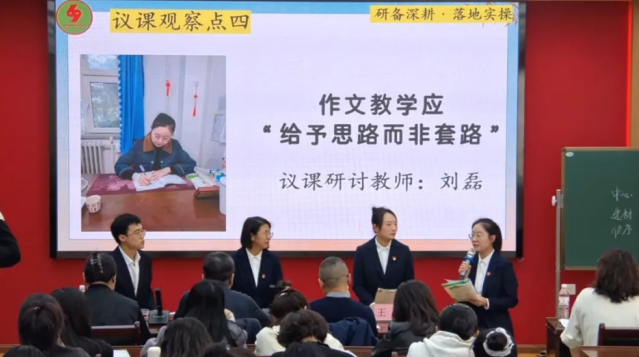 六十九中學(xué)備課組長王琿玥展示了組內(nèi)作文教學(xué)實(shí)踐成果,闡述“備上議評講”備課環(huán)節(jié)與“四階實(shí)施框架”,直觀呈現(xiàn)了系統(tǒng)化教學(xué)的實(shí)際成效。