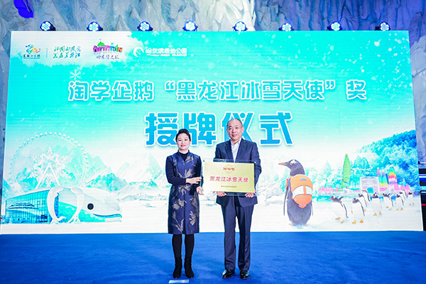 黑龍江省文化和旅游廳黨組書記、廳長何晶為“淘學企鵝”頒發(fā)“黑龍江冰雪天使”獎牌。