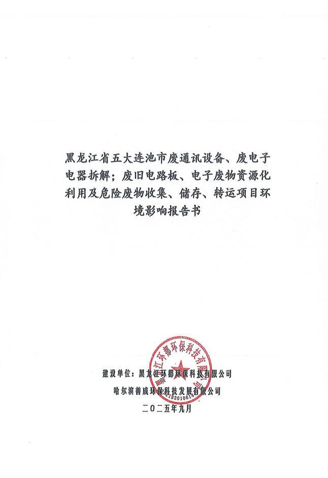 黑龍江省五大連池市廢通訊設備、廢電子電器拆解;廢舊電路板、電子廢物資源化利用及危險廢物收集、儲存、轉運項目環境影響報告書及公眾參與說明